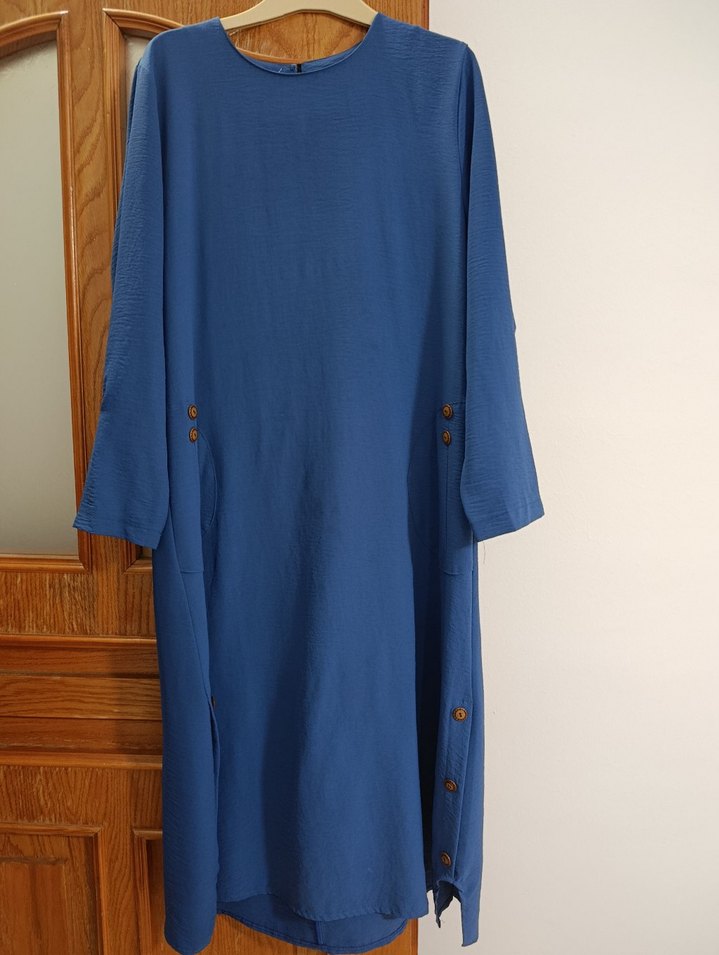 Lacivert uzun keten tunik, bol kesim ve yanlarda düğme detaylarıyla. Uzun kollu, sade yuvarlak yakalı, minimal tasarım.