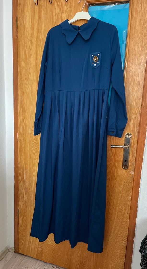 Lacivert renginde, uzun kollu, yaka detaylı ve düğmeli kadife kumaştan yapılmış, nakışlı cep detaylı uzun elbise. Ofis kullanımı için uygundur.
