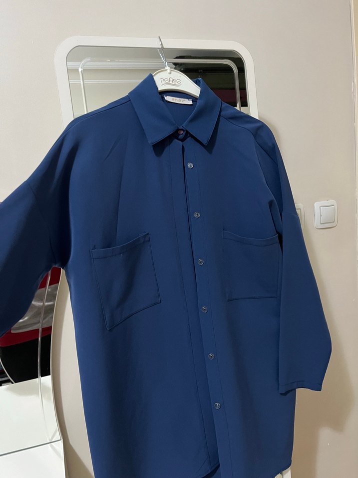 Düğmeli, cep detaylı, uzun kollu ve notched lapel yakalı lacivert midi gömlek. Rahat kesimi ve sentetik kumaşıyla günlük kullanıma uygundur. M L uyumlu