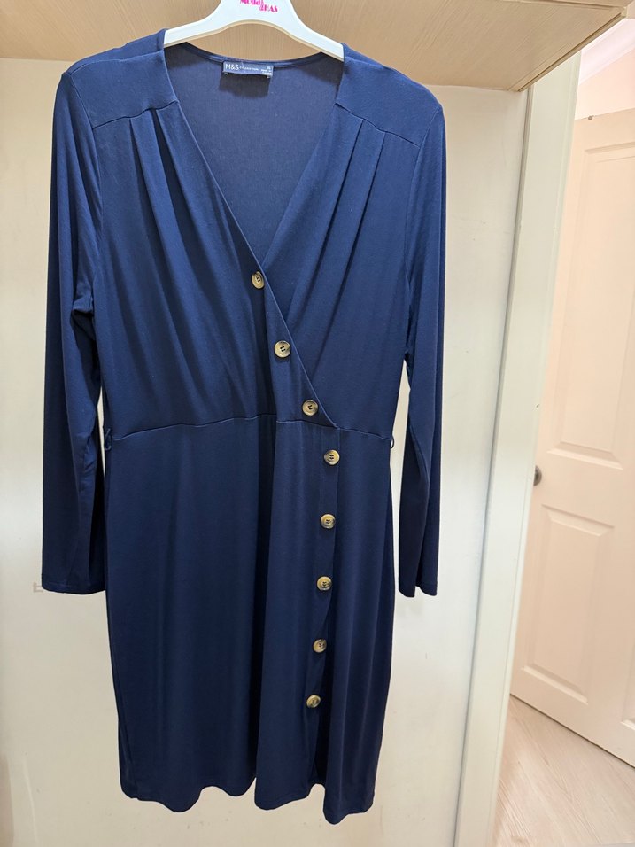 Düğmeli, V yaka ve uzun kollu Marks and Spencer marka lacivert uzun elbise. Kumaşı tiril tirildir, tertemiz bir ürün. İsterseniz ofis şıklığı isterseniz özel davetlerde rahatlıkla kullanabilirsiniz