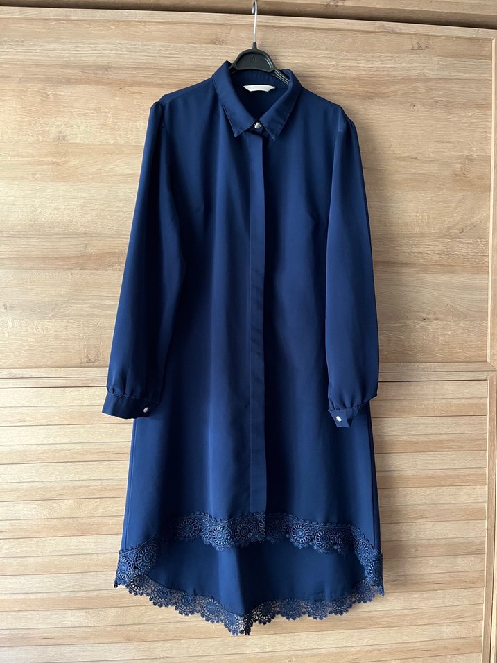 Lacivert renkte, uzun kollu, düğmeli ve yakalı kadın tunik. Düz kesim ve uzun boy, dantel detaylı etek ucu ile ofis için uygun, yumuşak sentetik kumaştan.