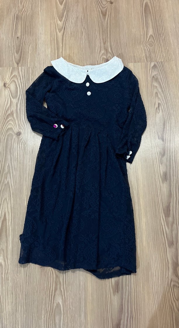 Lacivert uzun triko elbise, yakalı ve düğmeli detaylara sahiptir. Bol kesim ve uzun kolludur, gotik tarzı yansıtır.
