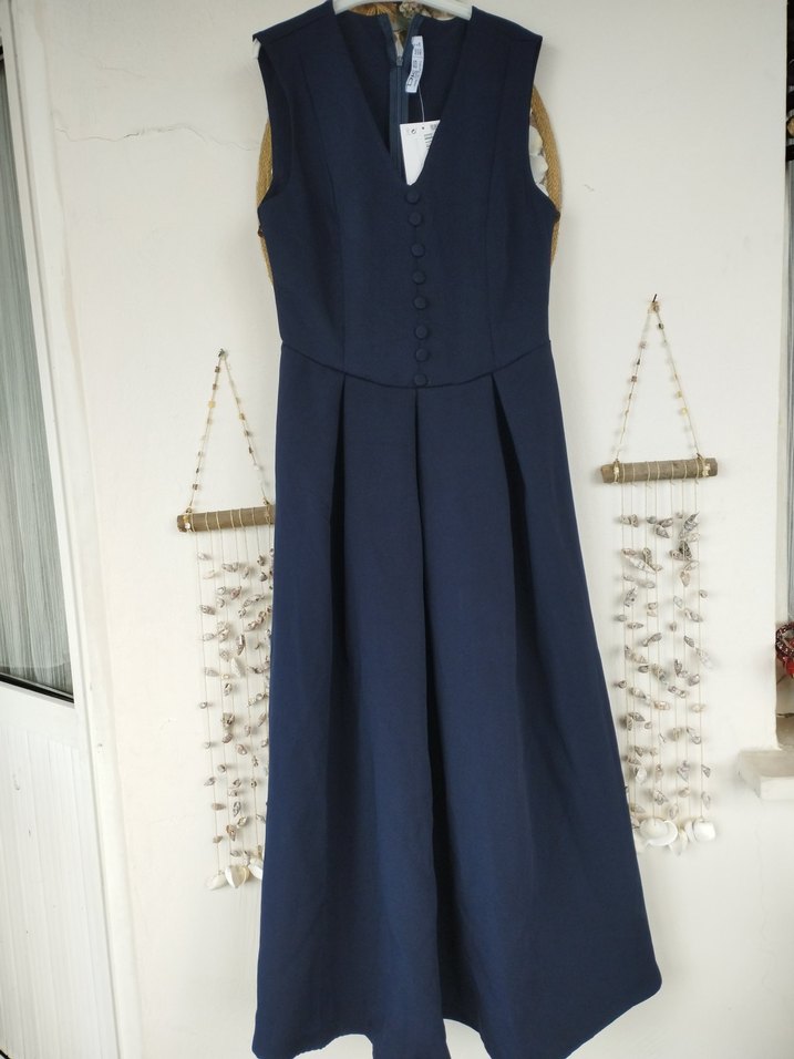 Lacivert uzun elbise, düğmeli ve kesik yakalıdır. Kolsuz ve regular fit, düz sentetik kumaştan üretilmiştir, ofis için uygundur.