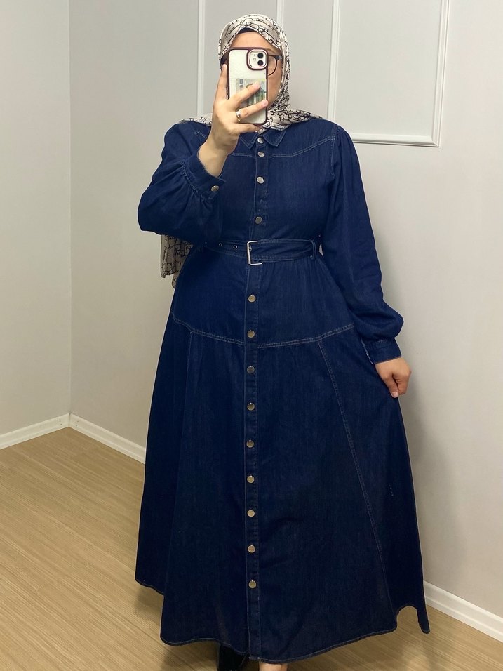 Lacivert kot kumaştan, düğmeli uzun ve bol kesim elbise. Uzun kollu, yakası kesik detaylı, belde kemerli, günlük kullanıma uygun rahat bohem tarzda.
