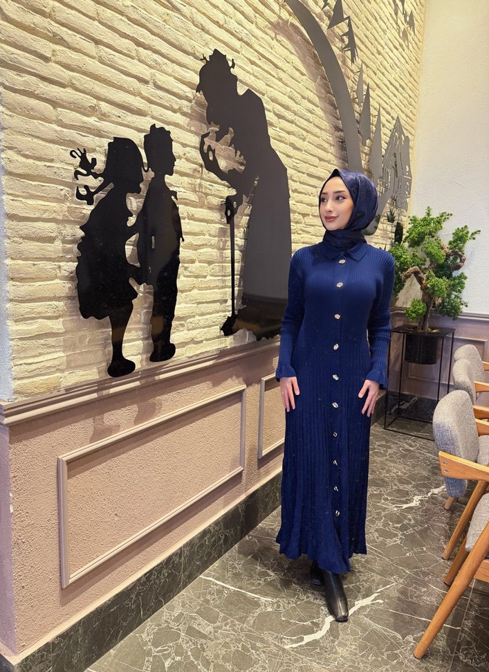 Lacivert renkte, yüksek yakalı ve uzun kollu, düz desenli, düğmeli uzun tesettür elbise. Sentetik kumaştan, günlük kullanıma uygun sade ve modest kesim.