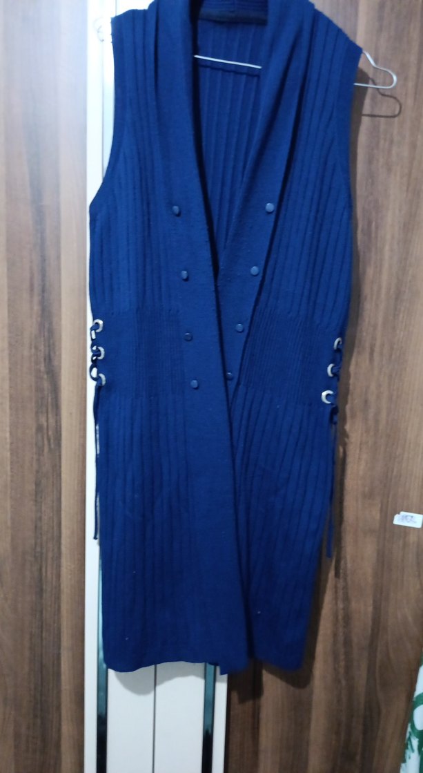 Lacivert uzun triko yelek, düğmeli ön ve kesik yaka detaylarına sahiptir. Kolsuz ve rahat kesimli, gündelik kullanıma uygundur. Sade ve rahat, trend bir normcore stilini yansıtır.