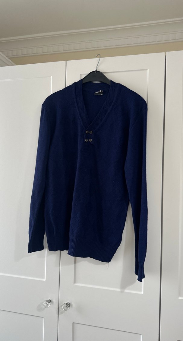 Yumuşak yün kumaştan yapılmış, düğmeli V yakalı ve uzun kollu erkek kazak. Rahat kalıbı ve normal boyu ile günlük kullanıma uygundur. Lacivert rengi klasik bir görünüm sağlar.
