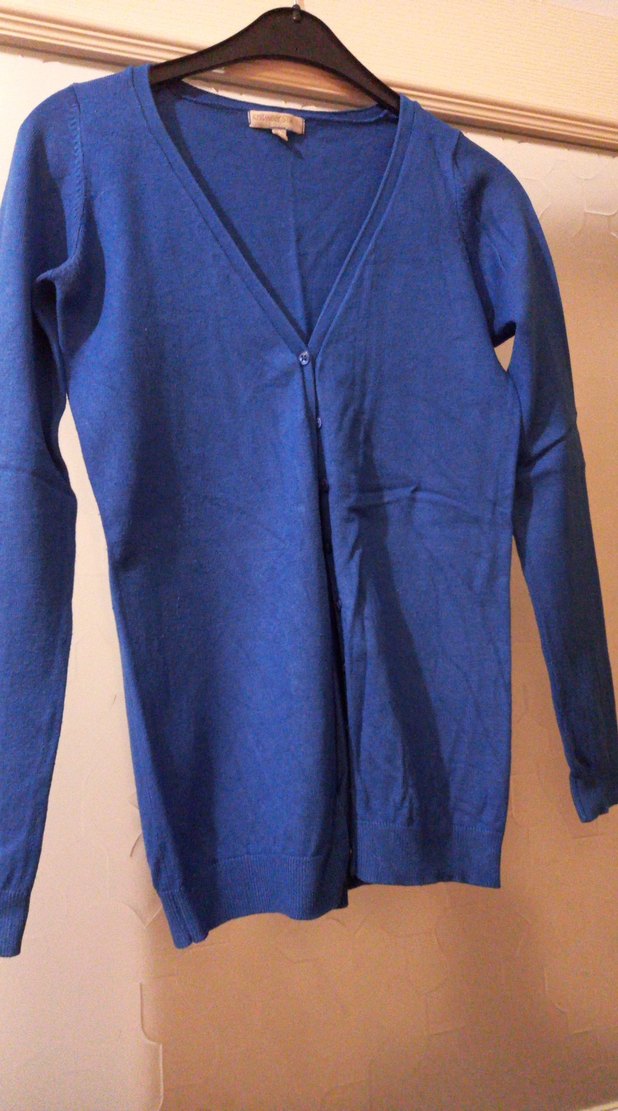 Düğmeli, lacivert, V yakalı, pamuklu kumaştan, uzun kollu ve midi uzunlukta, rahat kesim kadın hırka. S beden uyumlu