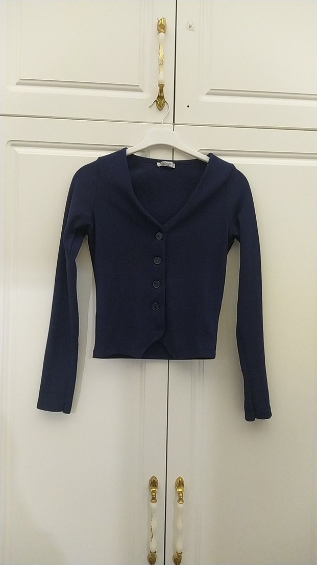Düğmeli ön kısmı, uzun kollu ve V yakalı, yumuşak örme kumaştan yapılmış, normal midi boyda dar kesim lacivert hırka.