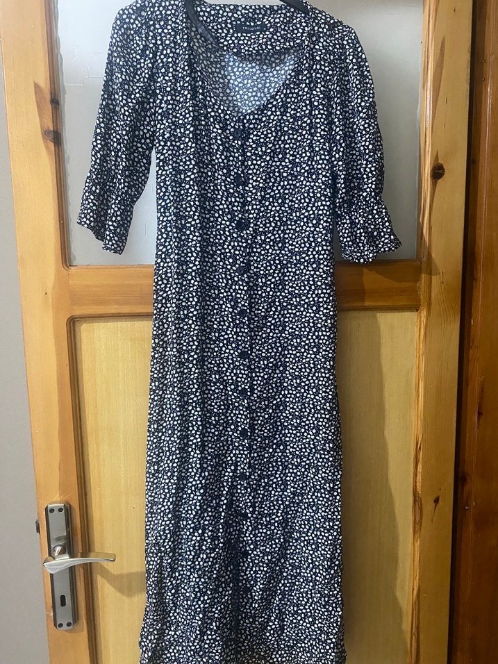 Lacivert renkte, düğmeli, V yakalı, kısa kollu, bol kesim uzun elbise. Hafif batik desenli, yumuşak sentetik kumaştan üretilmiştir.