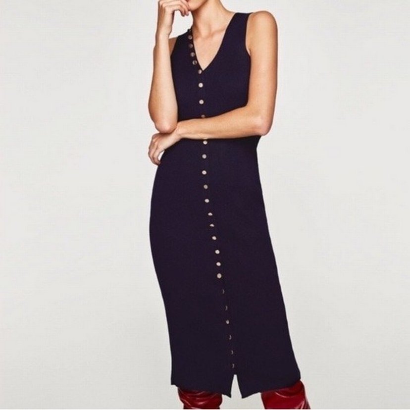 Düğmeli, V yakalı, lacivert uzun triko elbise, vücuda oturan kesimi ve kolsuz tasarımıyla romantik akşamlar için uygun. hiç kullanılmadı sadece etiketi yok