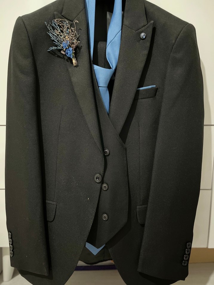 Düğmeli, normal kesim ve yaka detaylı bu erkek takım elbisesi lacivert ve siyah renktedir. Yelek ve mavi kravatla Gotik ve avant-garde tarzı yansıtır. Sadece 1 kez giyildi eşimin boyu 1.70