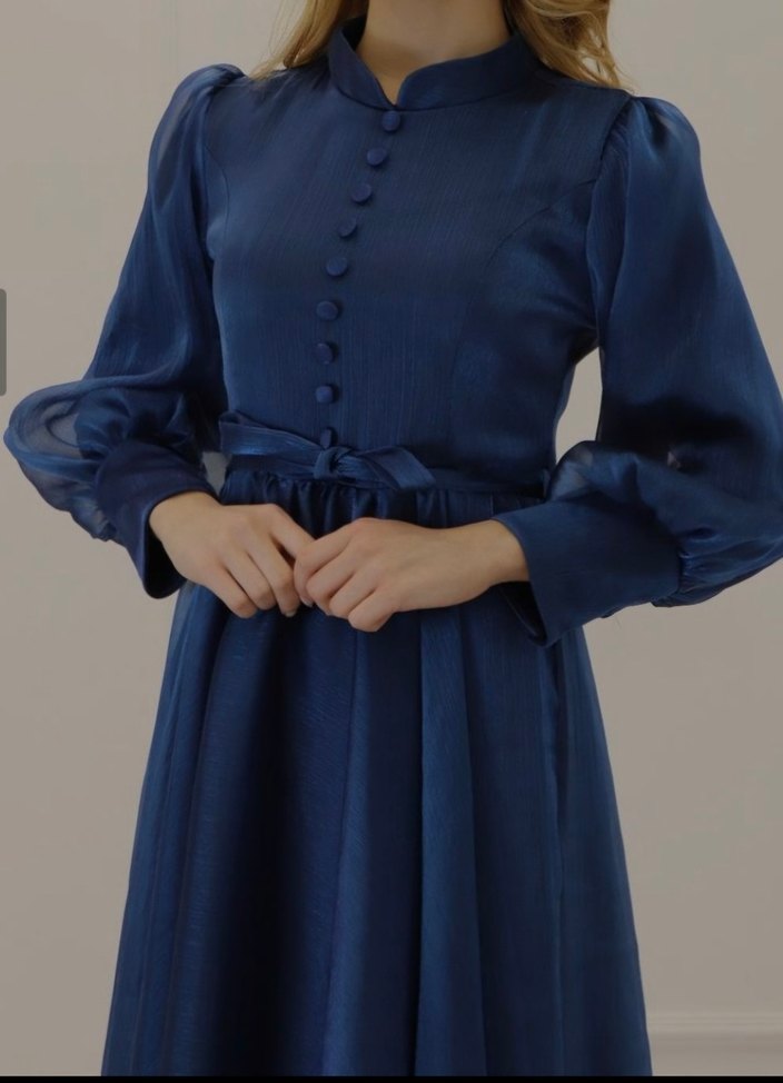 Lacivert uzun elbise, uzun kollu, düğmeli ve kesimli yakalıdır. İpek gibi kumaştan,janjan kumaş iki kere giyıldı tertemiz hıç bı kusuru yok yeni gibi 2 metre şalıyla beraber gönderim sağlanacak