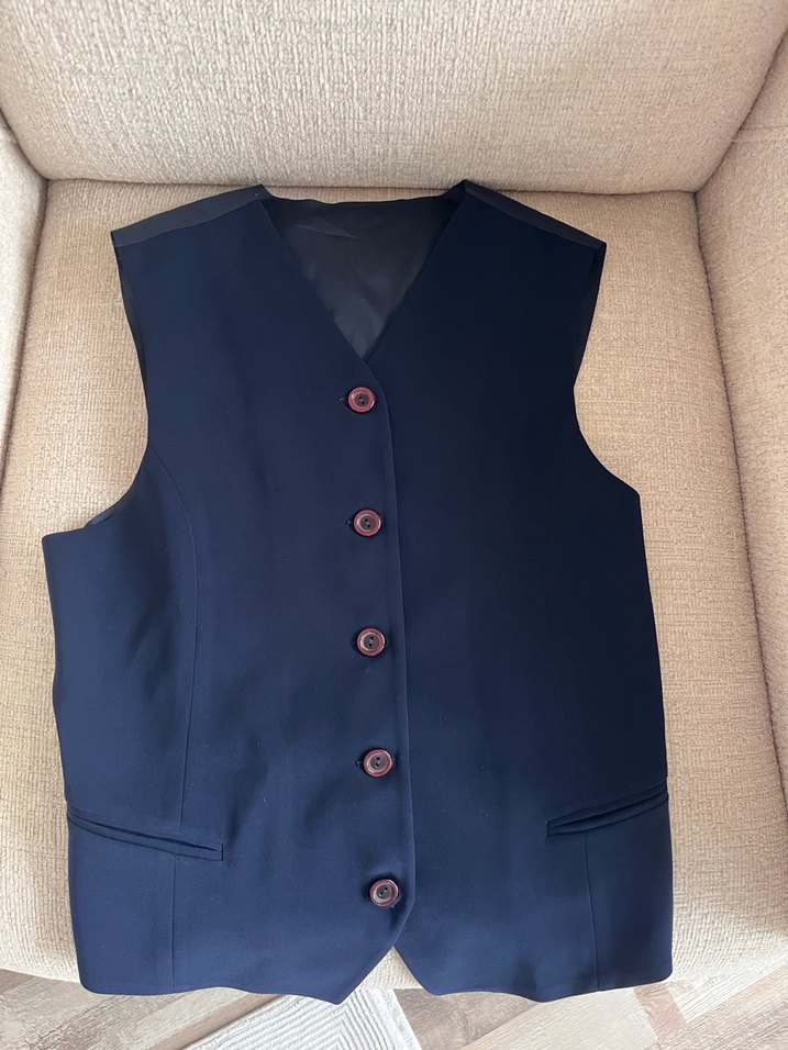 Düğmeli, çıtçıt yakalı ve kolsuz tasarıma sahiptir.Normal kesim, midi boy ve koyu lacivert renkte, ofis için uygun. 2 defa giyildi