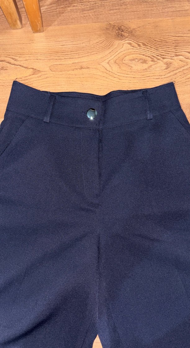 Düğmeli, midi boy, düz lacivert kadın kumaş pantolon. Ofis için uygun, rahat kesim ve sentetik kumaştan üretilmiştir.