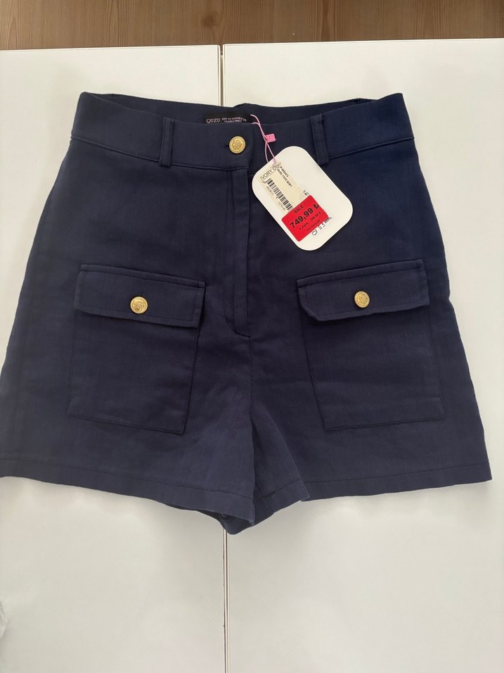 Lacivert renkte, düğmeli ve cep detaylı yüksek bel mini şort. Denim kumaştan, trend sokak stiline uygun.