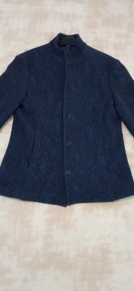 Lacivert yün kaban, düğmeli ön ve kesik yakaya sahiptir. Uzun kollu, midi boy ve normal kesimdir, iş ortamına uygundur.