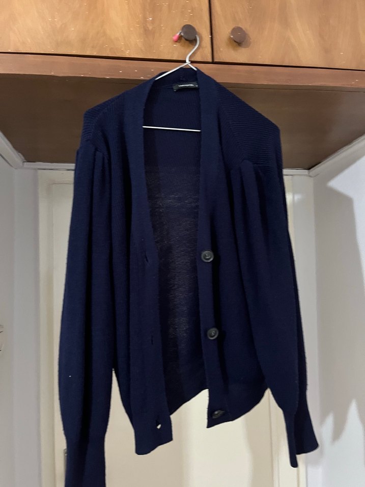 Düğmeli önü ve notlu yaka detayı olan lacivert yün hırka. Uzun kollu ve bol kesim, günlük rahat kullanım için uygundur.
