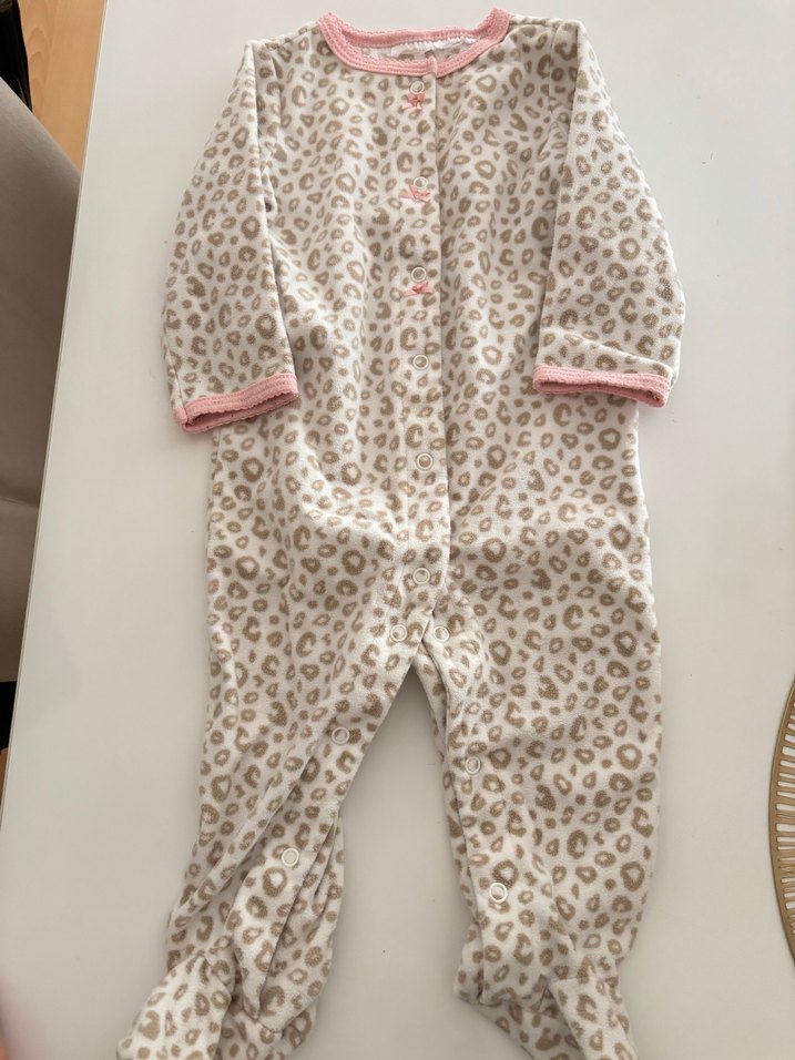 Düğmeli, pastel kahverengi leopar desenli, pembe detaylı yumuşak kumaştan bebek tulumu. Etiketi yok aylık olarak 6-9