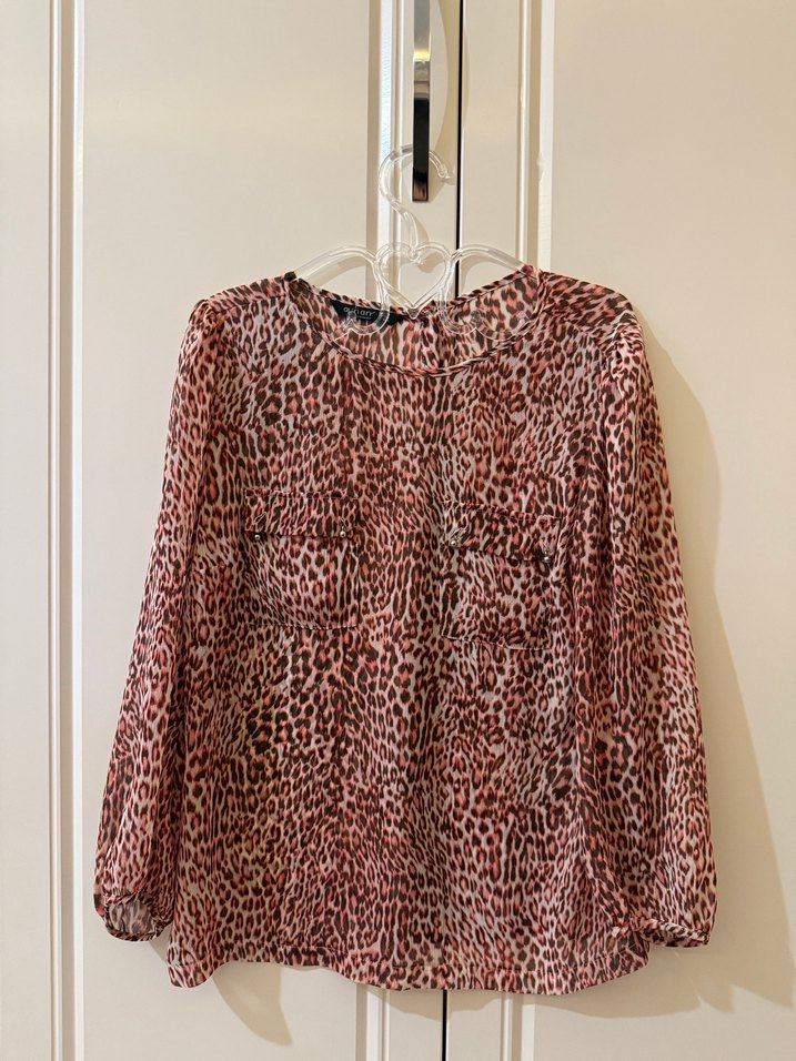 Kahverengi, düğmeli, leopar desenli kadın bluz. Uzun kollu, V yaka ve bol kesim, yumuşak sentetik kumaştan, günlük kullanıma uygun. Bir kez kullanıldı.