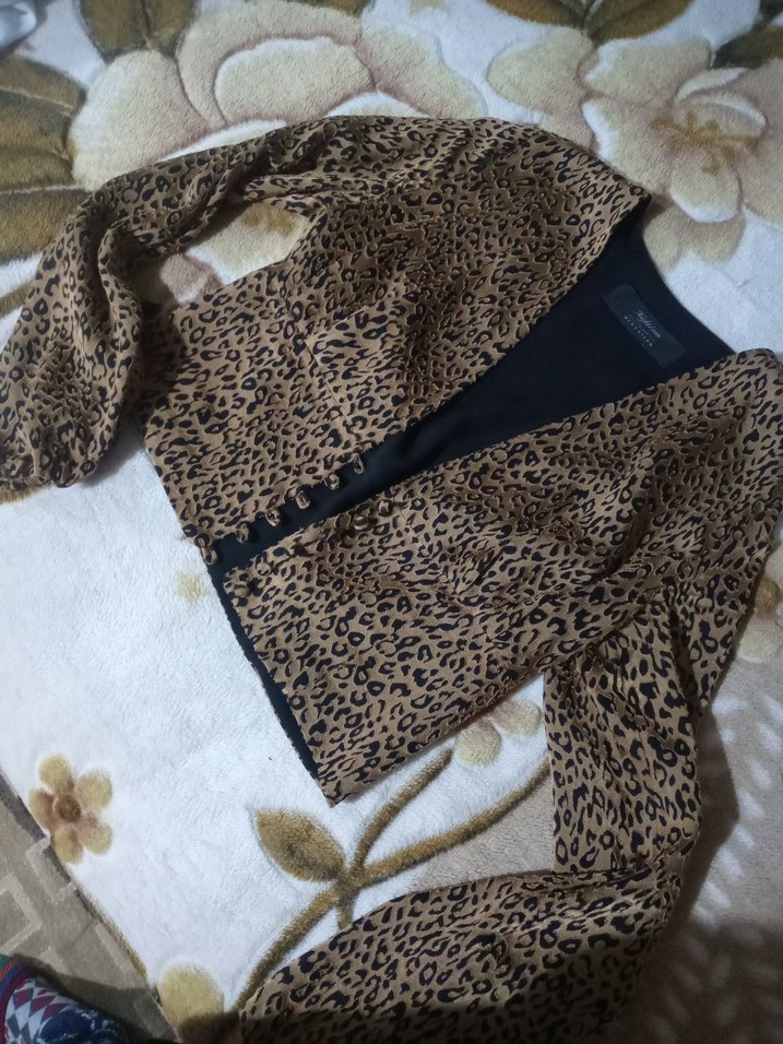 Düğmeli, leopar desenli kahverengi bluz, uzun kollu ve V yakalıdır. Rahat kesimi ve midi boyuyla günlük rahat stil için uygundur. Sentetik kumaştan üretilmiştir.