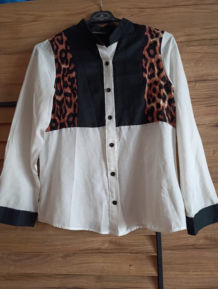 Uzun kollu, düğmeli ve yakalı bu kadın gömlek, leopar desenli koyu renkli ve beyazın birleşiminden oluşur.M beden 1 kez giyildi