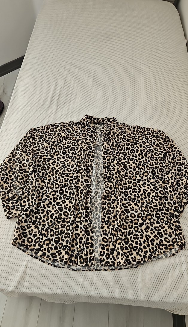 Düğmeli, uzun kollu, yakalı ve bol kesim kadın gömlek. Kahverengi leopar desenli, sentetik kumaştan, günlük kullanım için uygun.