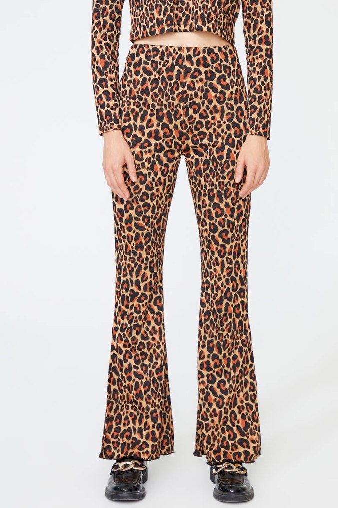 Düğmeli, leopar desenli, koyu kahverengi ispanyol paça pantolon. Sentetik kumaştan, casual tarz ve romantik akşamlar için ideal.