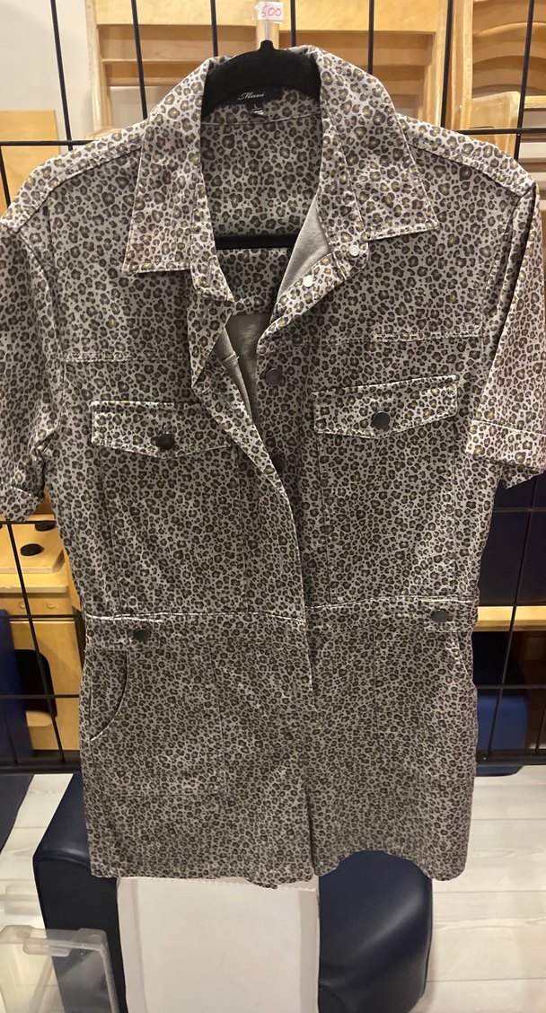 Kadınlar için kısa kollu, düğmeli ve leopar desenli tulum. Notch yakalı, sentetik kumaştan, gri ve kahverengi tonlarda, günlük rahat stil için uygun.