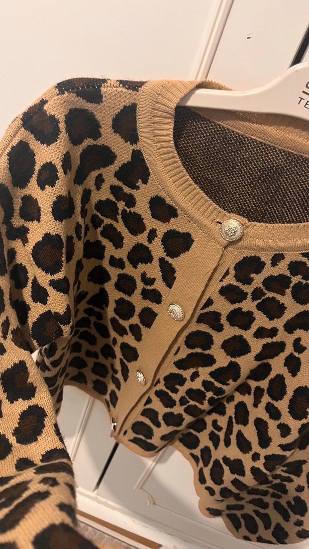 Kahverengi tonlarda leopar desenli, kısa boylu ve bol kesim kadın hırka. Uzun kollu, yuvarlak yaka ve düğmeli, örme kumaştan rahat bir üründür. Trendy sokak tarzına uygundur.