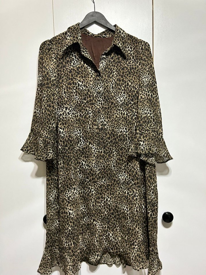 Düğmeli, uzun kollu, yakalı ve leopar desenli kahverengi midi elbise, bol kesim ve yumuşak sentetik kumaştan yapılmıştır.
