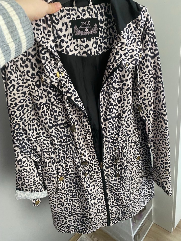 Gri renkte, düğmeli ve leopar desenli midi kadın ceket. Sentetik kumaştan, uzun kollu ve bol kesimdir, günlük rahat şıklık için uygundur. Yeşil olan 34 beden ve hiç kullanılmadı ekose içi ikisinin fiyatı ikili yollayacağım