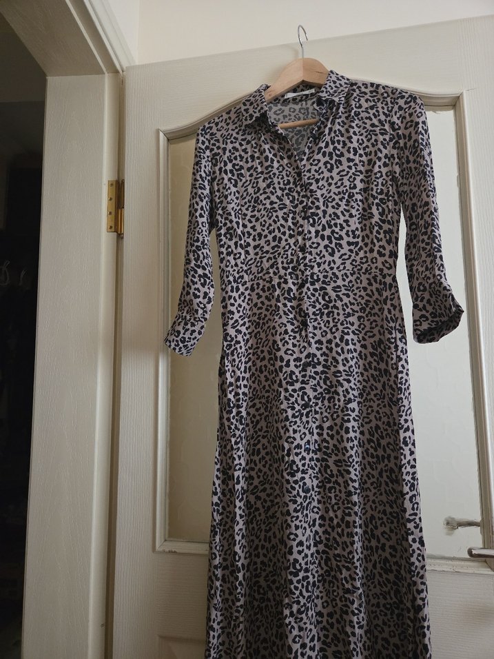 düğmeli ve uzun kollu, leopar desenli uzun elbise. Rahat kesimi ve yakalı tasarımıyla günlük sokak stiline uygundur.