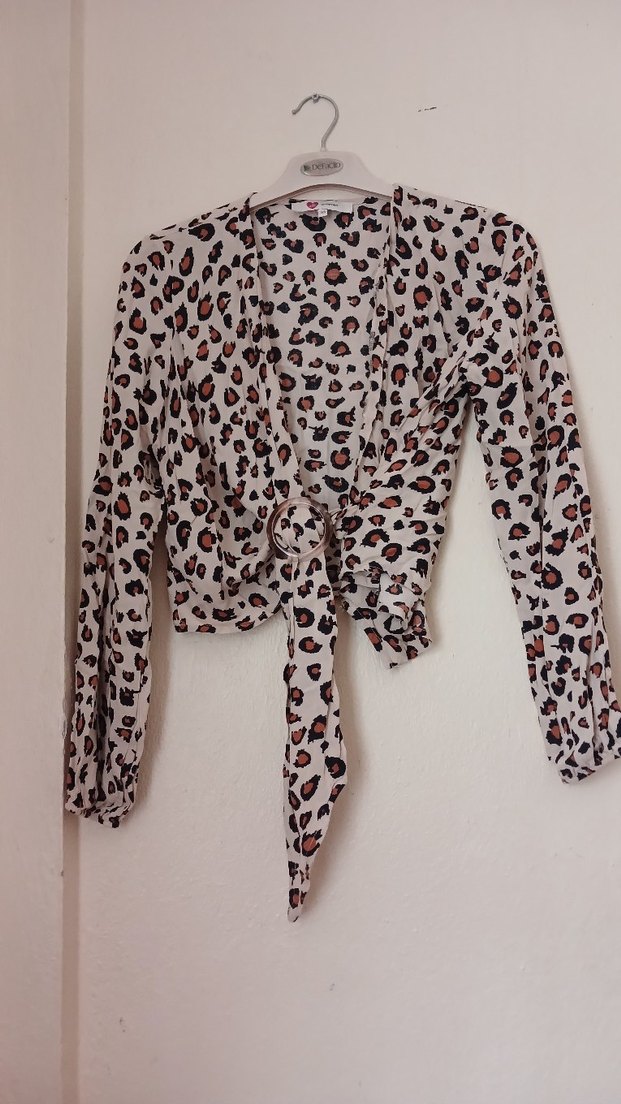 Düğmeli, uzun kollu, V yakalı, leopar desenli, kahverengi ve gri tonlarında sentetik kumaştan rahat kesim kadın bluz.