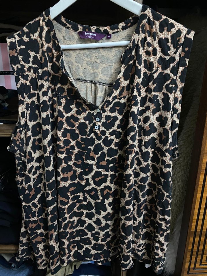 Düğmeli, leopar desenli, V yaka, kolsuz, normal uzunlukta, rahat kesim kadın bluz. Sokak stiline uygun, kahverengi tonlarında, sentetik kumaştan üretilmiştir.
