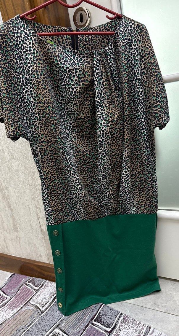 Düğmeli Leopar Desenli Yeşil Kadın Elbise