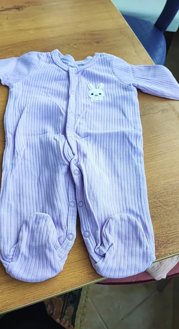 Düğmeli, küçük tavşan detaylı pastel lila renkli bebek kız tulumu. Yumuşak kanal desenli kumaştan yapılmıştır.