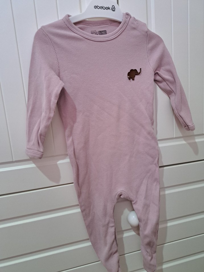 Pastel lila renkli, düğmeli, uzun kollu bebek tulumu. Küçük fil detayı bulunur, desensizdir. Marka: ebebek.