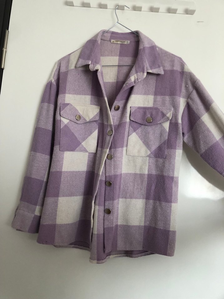 Pamuklu, düğmeli, lila pastel kareli, uzun kollu, geniş kesim kadın gömlek. Notlu yaka ve cep detaylarıyla günlük sokak stiline uygun.