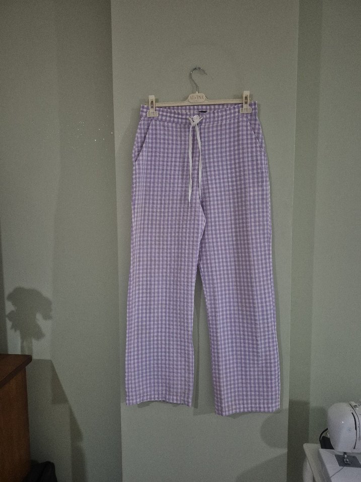 Düğmeli, normal boy, lila kumaştan salaş kesim pantolon. Pastel tonlarda, günlük kullanıma uygun rahat bir model.