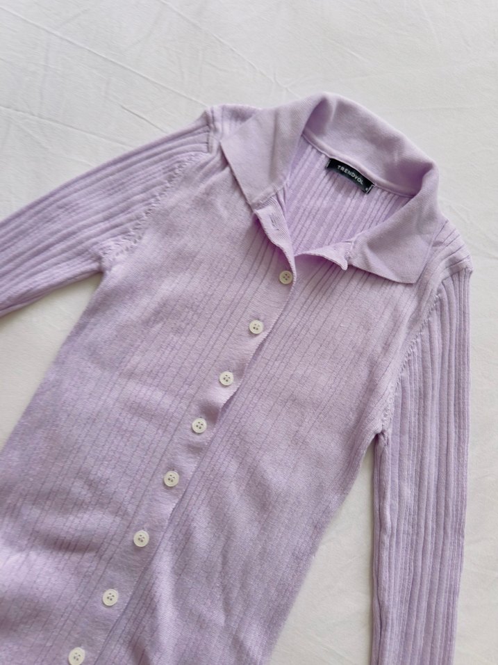 Pastel lila renkte, düğmeli, uzun kollu ve yakalı triko hırka. Yumuşak penye kumaştan, rahat ve midi boyda, gündelik kullanıma uygun.