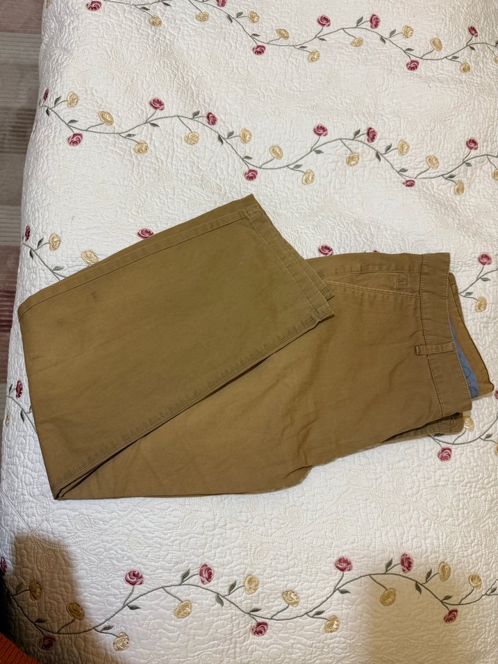 Düğmeli, loose fit, açık kahverengi pamuk erkek pantolon. Normal midi boyda, günlük rahat kullanıma uygun. Erkek kardeşim çok sayılı giydi kilo aldığı için satmaya karar verdik. Rengi çok hoş bi kahve bej arası bir renk.