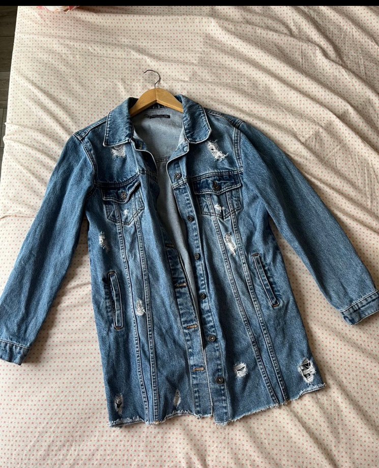 Mavi-gri kot kumaş, düğmeli, notched yakalı ve uzun kollu kadın ceket. Loose fit ve midi boy, günlük sokak stili için uygun. Yıpranmış detaylar bulunur.
