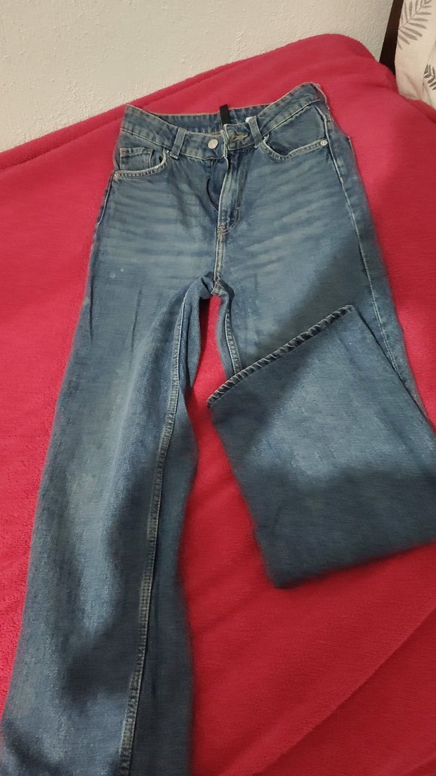 Mavi denimden, düğmeli, loose fit midi uzunlukta kadın kot pantolon. Günlük sokak stili için uygundur.