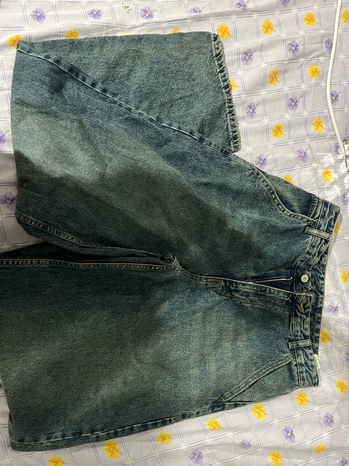 Düğmeli, gri tie-dye desenli, loose fit midi kadın kot pantolon, rahat günlük sokak stili için uygundur.