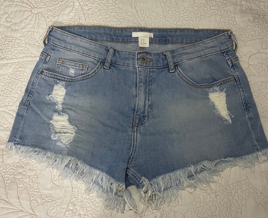 Düğmeli, bol kesim mini denim şort, püsküllü kenar detaylı. Gri-mavi renk, gündelik sokak stili için uygun.