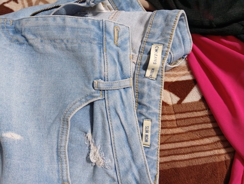 Düğmeli, yıpratılmış detaylı, loose fit mavi mini denim kadın jean. 'SLIMMOM' etiketi bulunur. Rahat sokak stiline uygun.