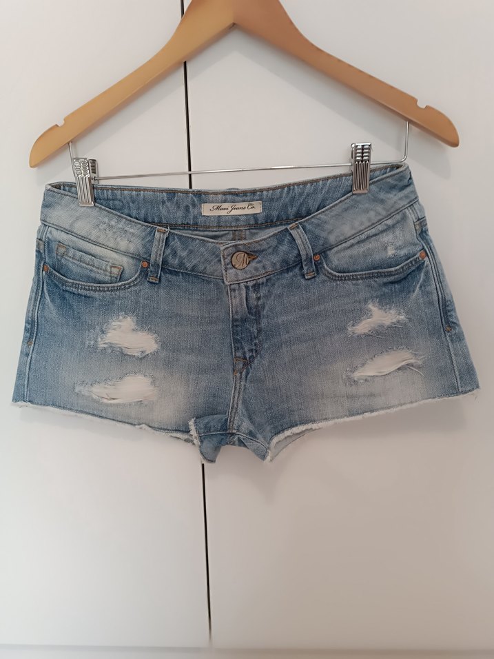 Düğmeli, loose fit, pastel mavi renkli mini denim şort, tie-dye desenli, günlük sokak stiline uygun.