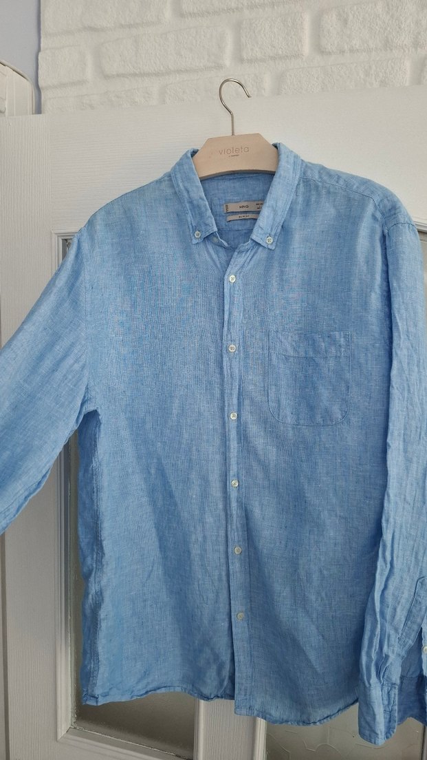 Mango Man Düğmeli önü ve yakalı boynu olan, nefes alabilen keten kumaştan yapılmış uzun kollu erkek gömlek. Gri tonlu mavi renkte, normal boy ve rahat kesim, günlük sokak tarzı için uygun.