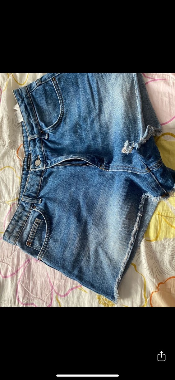 Düğmeli, bağlama desenli, bol kesim mavi kot şort. Kısa boy ve rahat sokak stili, günlük kullanım için uygun.